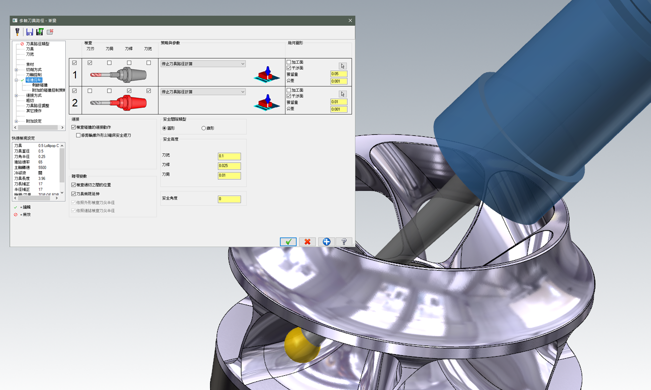 透過碰撞控制的設定能夠更加精確地控制刀軸,也能決定遇到干涉時要使用何種解決方式來應對。